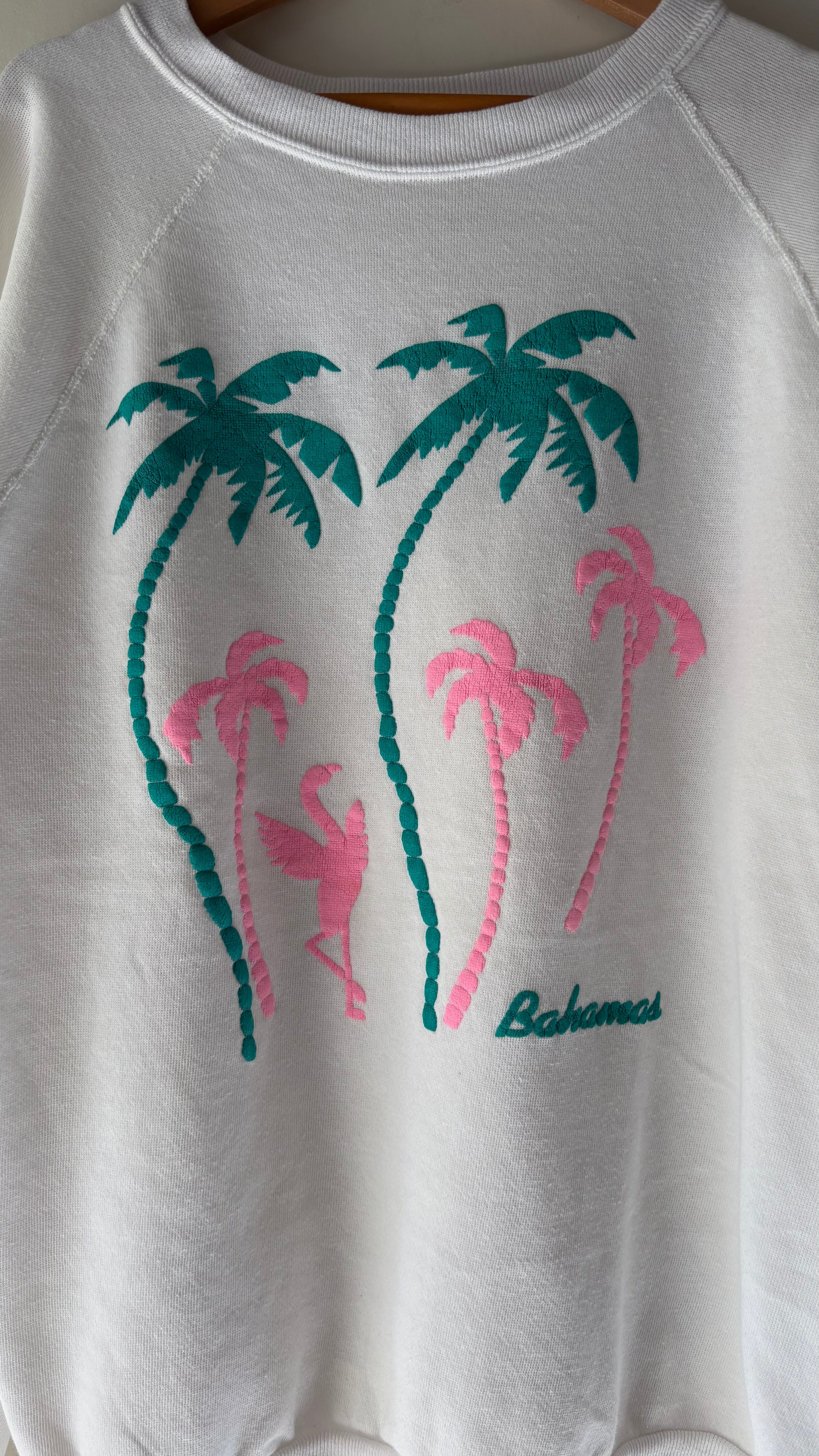 ⚫︎ 柔らかいオフホワイトボディに、ヤシの木とフラミンゴのプリントが映えるスウェットトップスです。