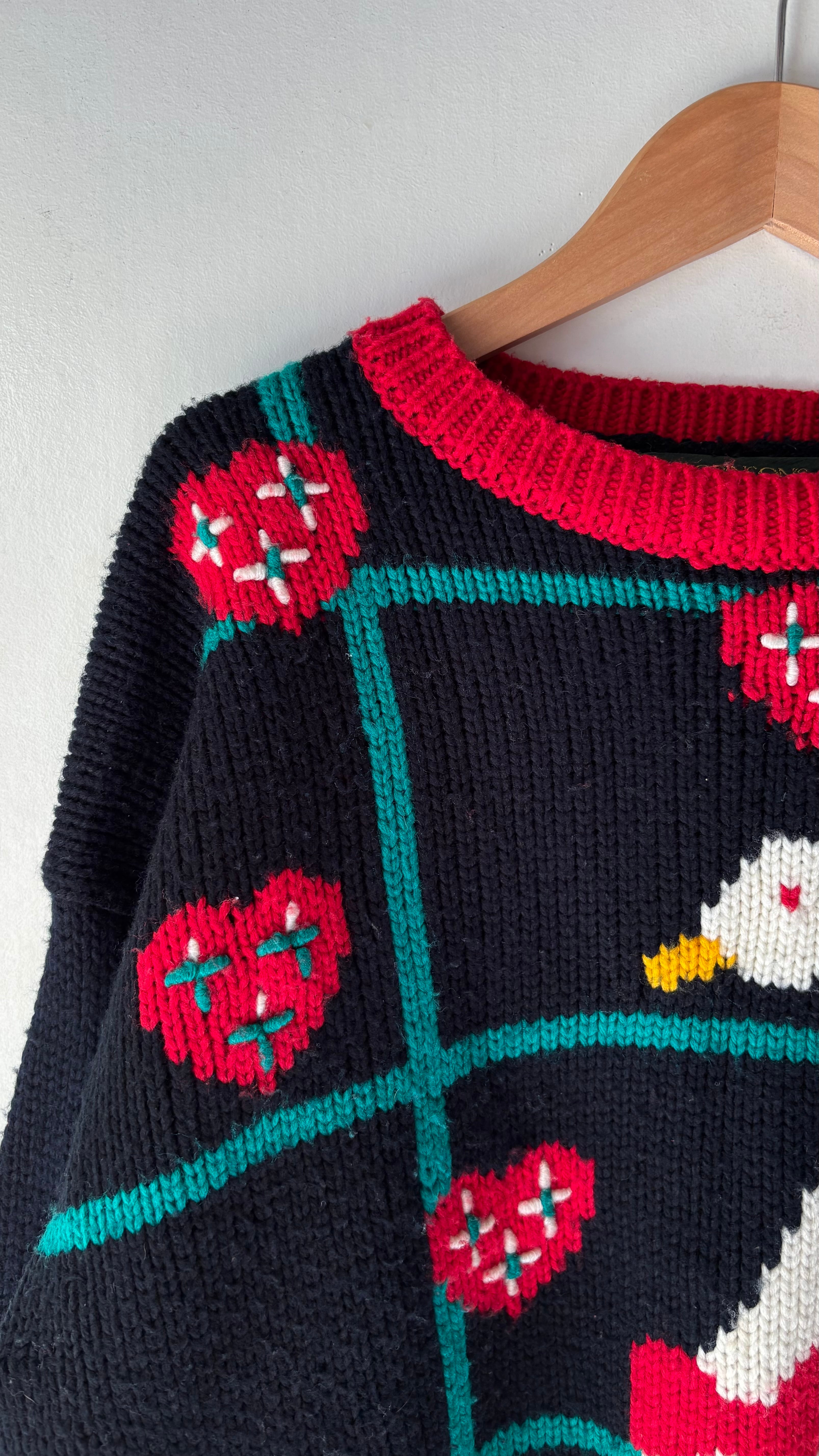 ⚫︎真ん中に大きなアヒルのモチーフと、まわりに散りばめられたハート柄が印象的で、冬の主役トップスにぴったりなニットです。