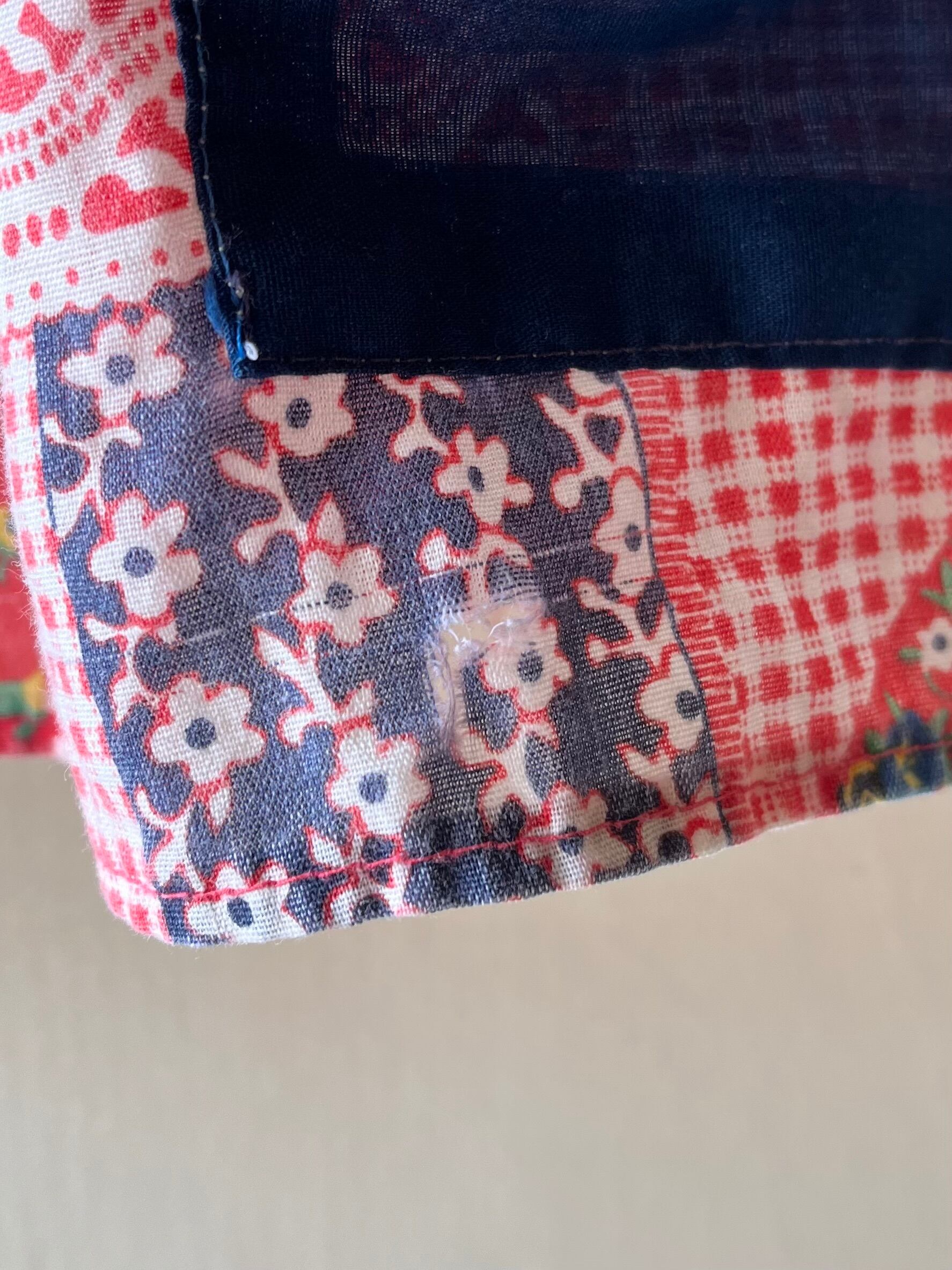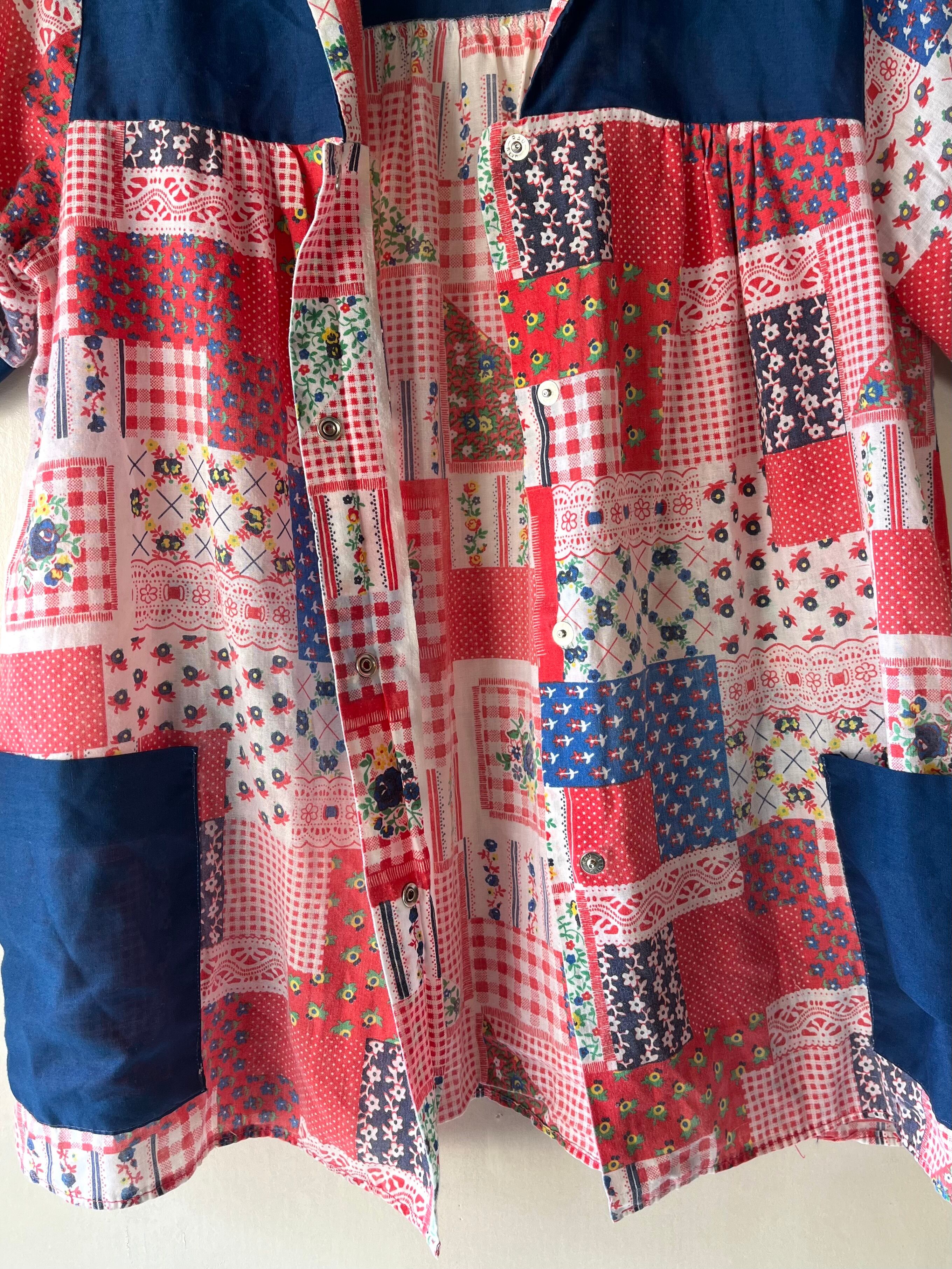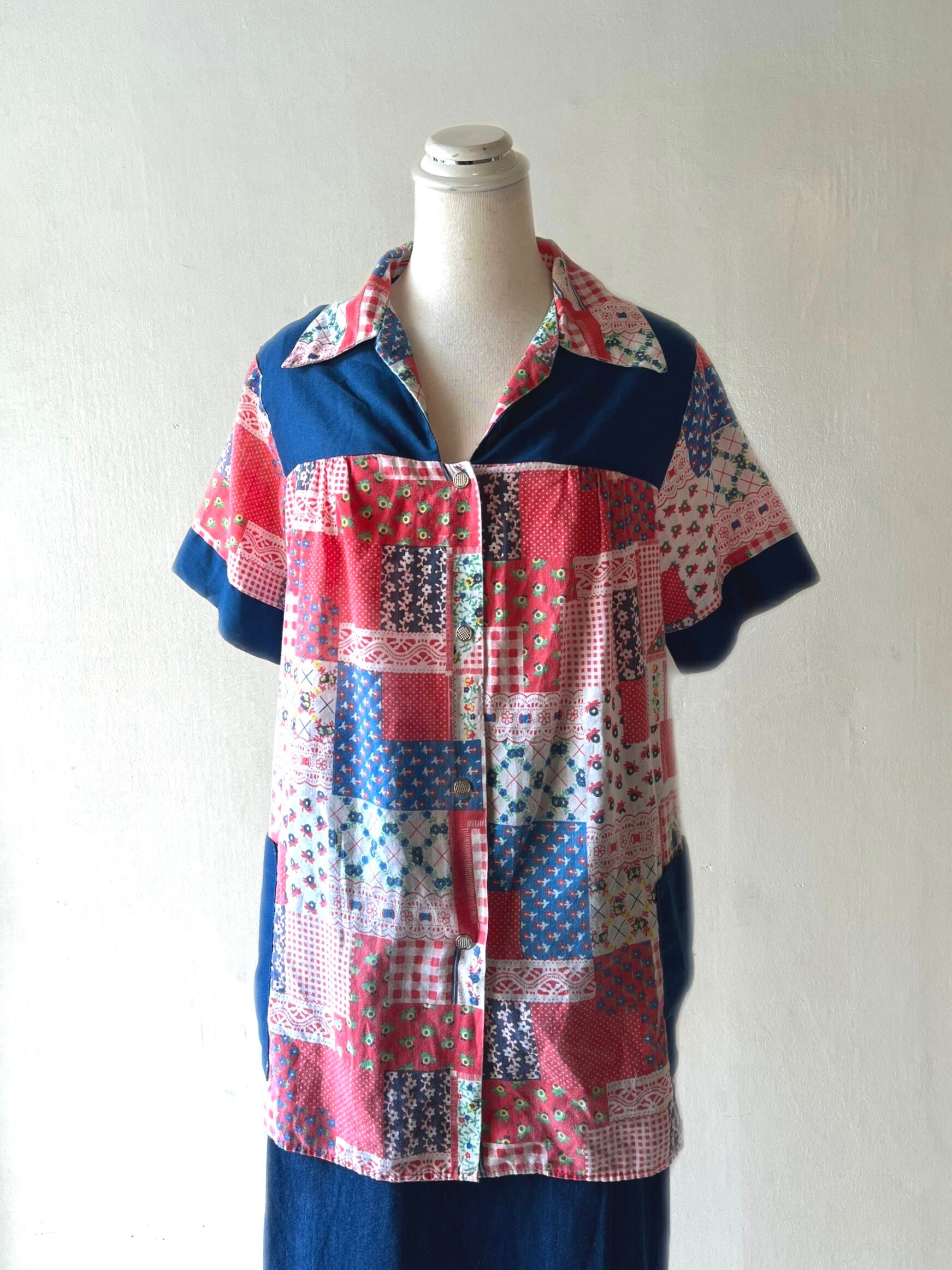 ⚫︎70年代頃のパッチワーク柄が可愛い半袖シャツです。当時のハンドメイドではないかと思います。