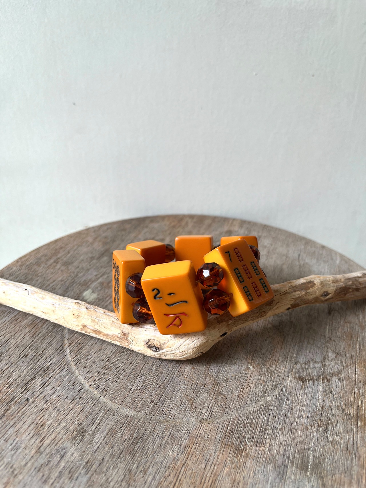 6つの麻雀牌が、茶のビーズで区切られ、ゴムで繋がれています。