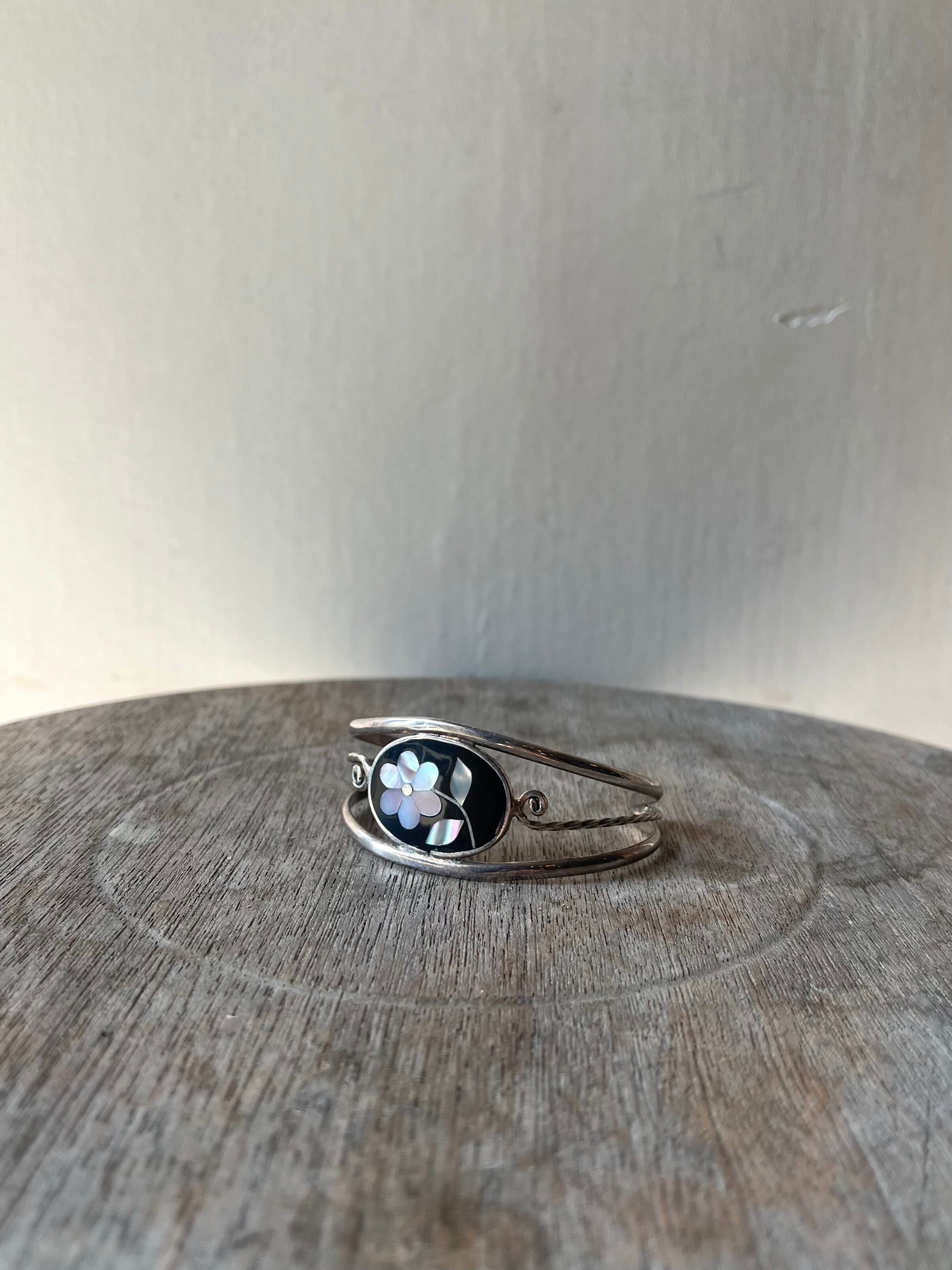 ⚫︎貝殻で花模様がデザインされたアルパカシルバーバングルです。