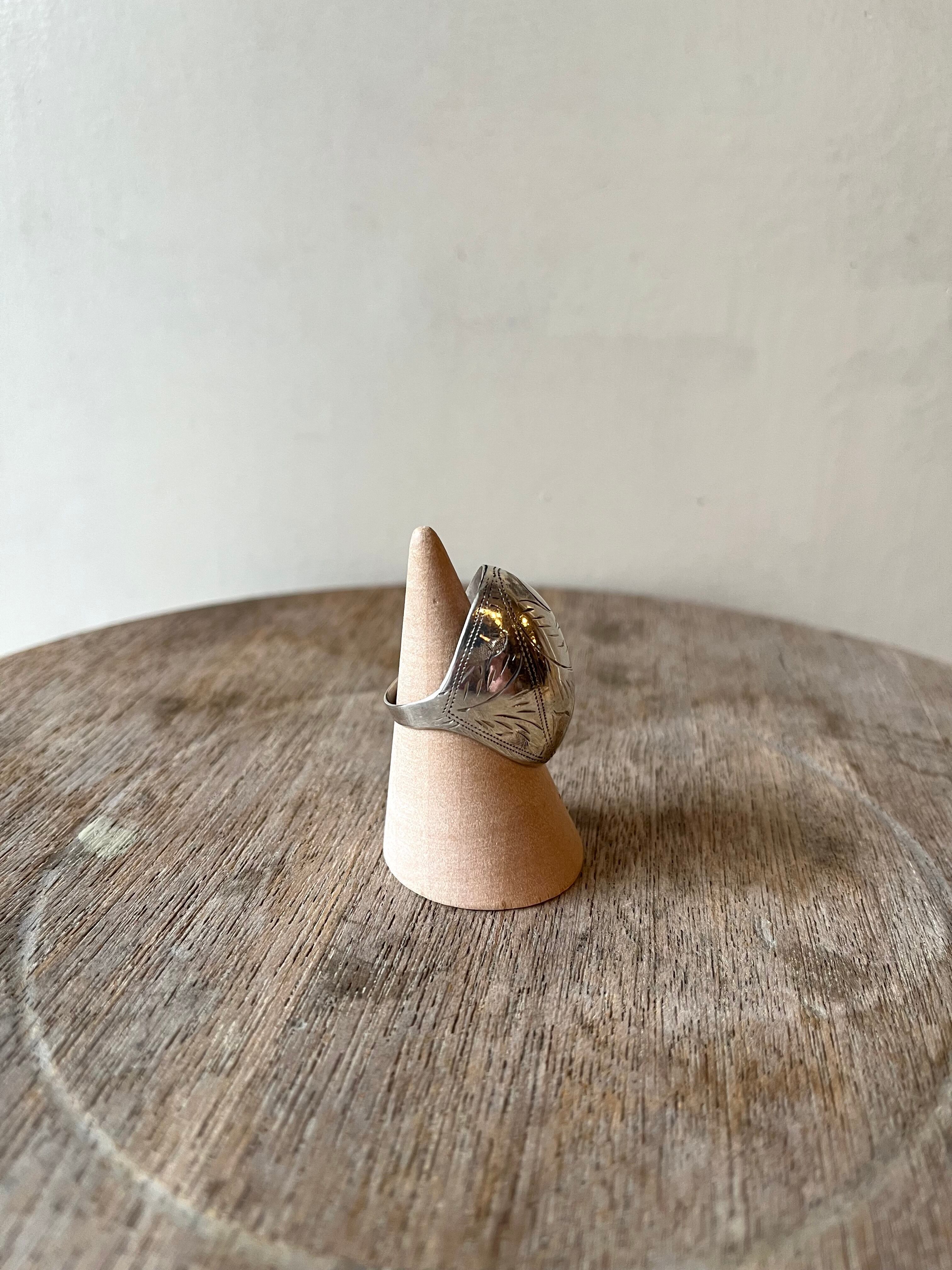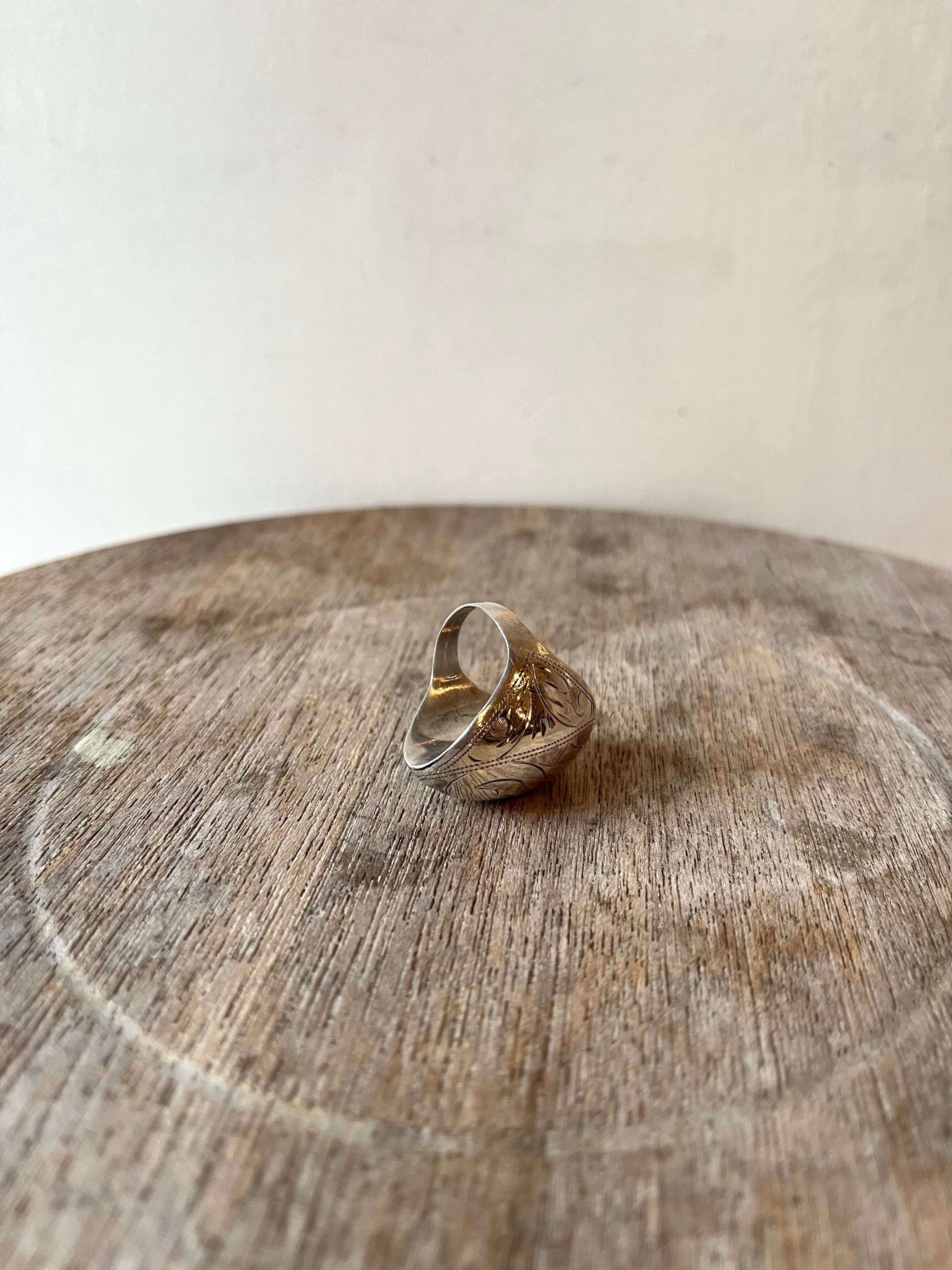 80年代頃の彫りのデザインが入ったリングです。見えにくいですが内側に925の刻印がございます。