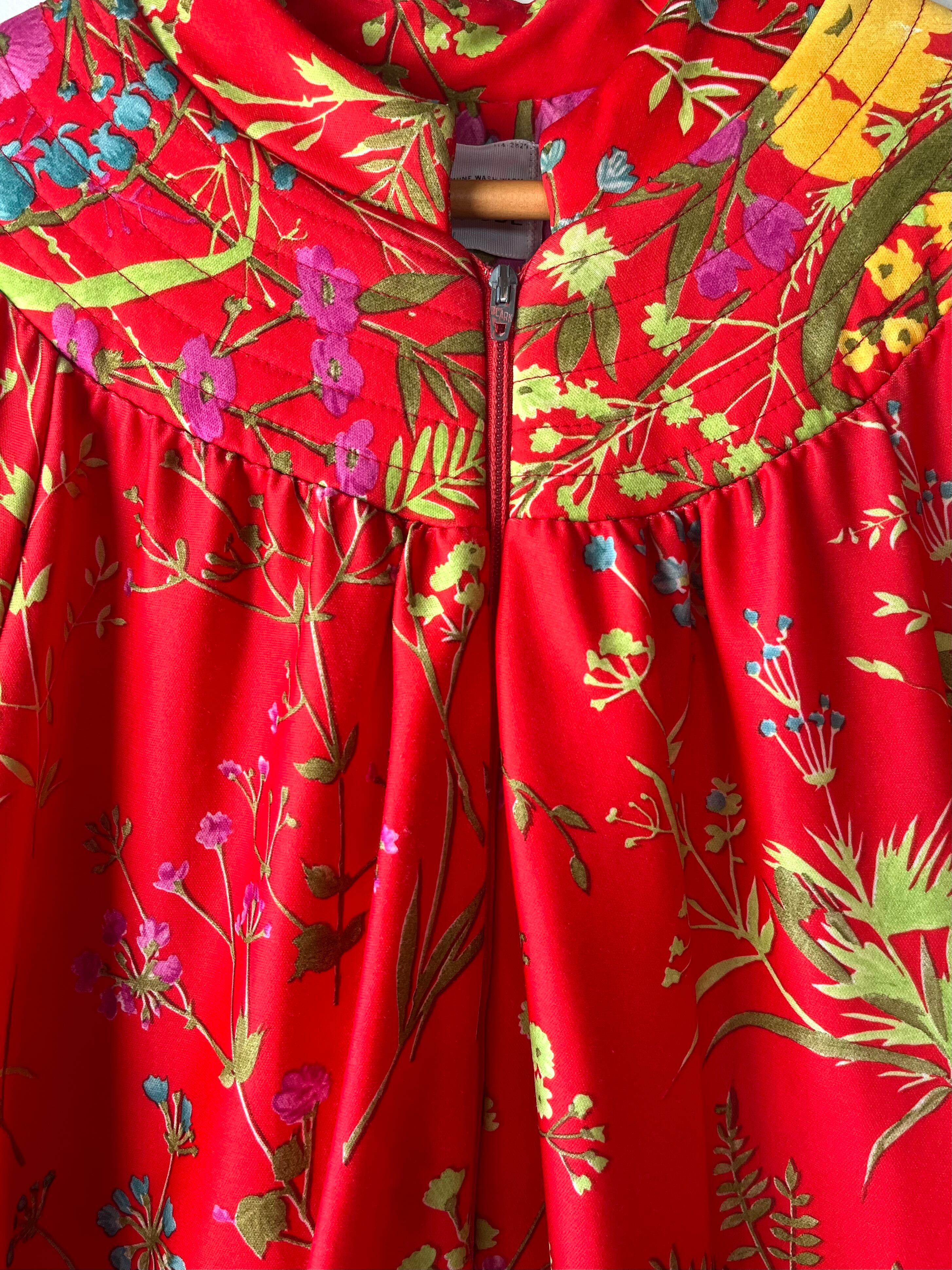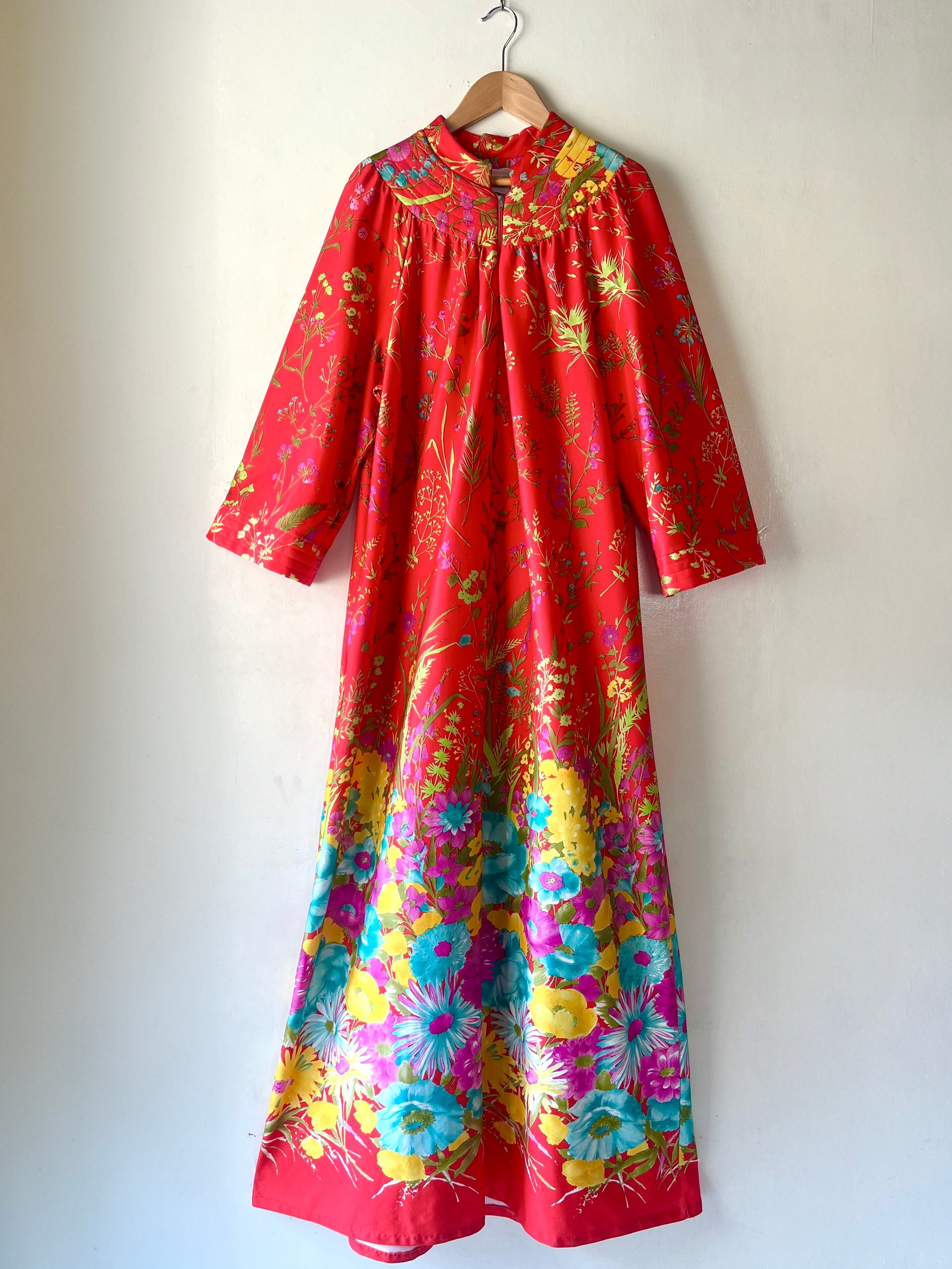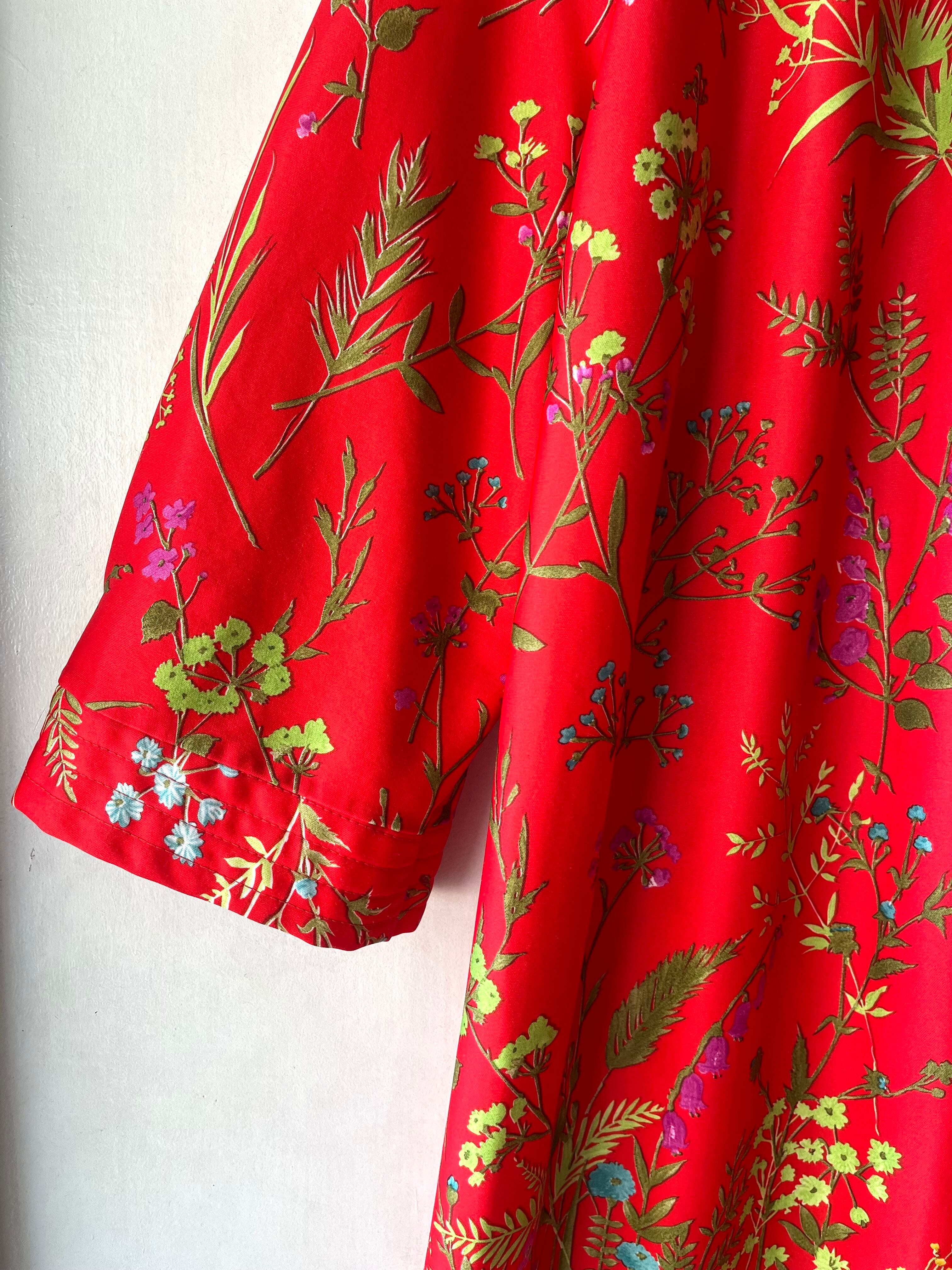 ⚫︎鮮やかな赤をベースに、たっぷりとお花や葉などが描かれた、華やかなドレスです。