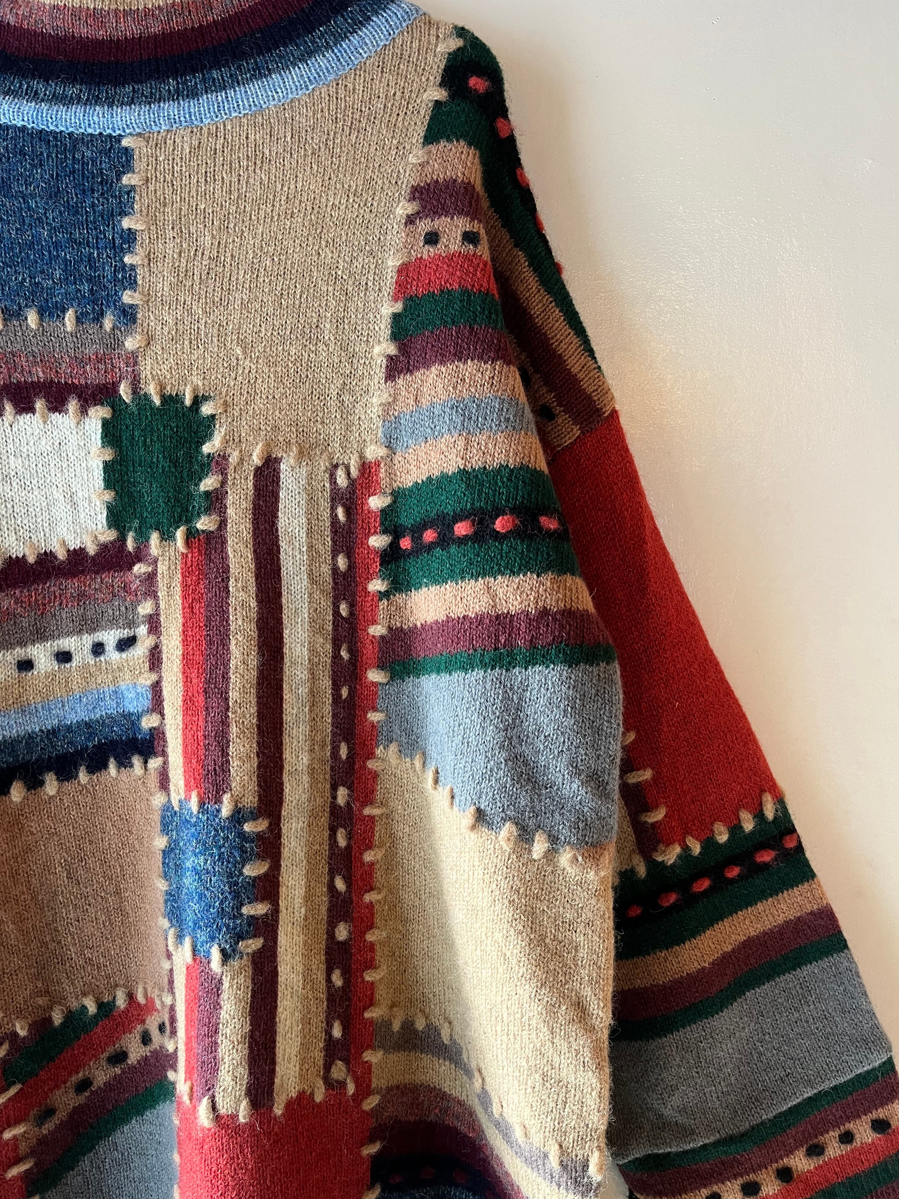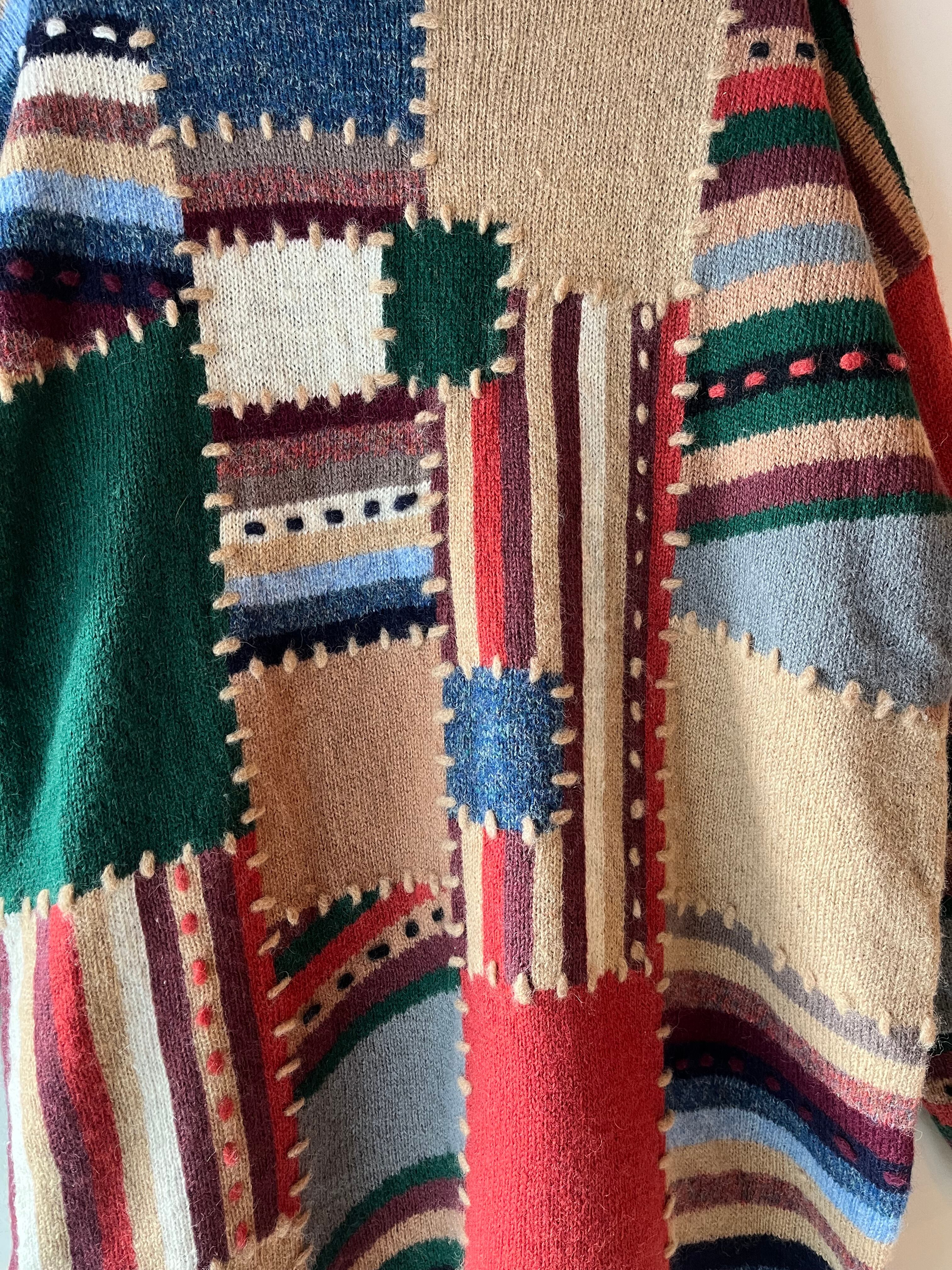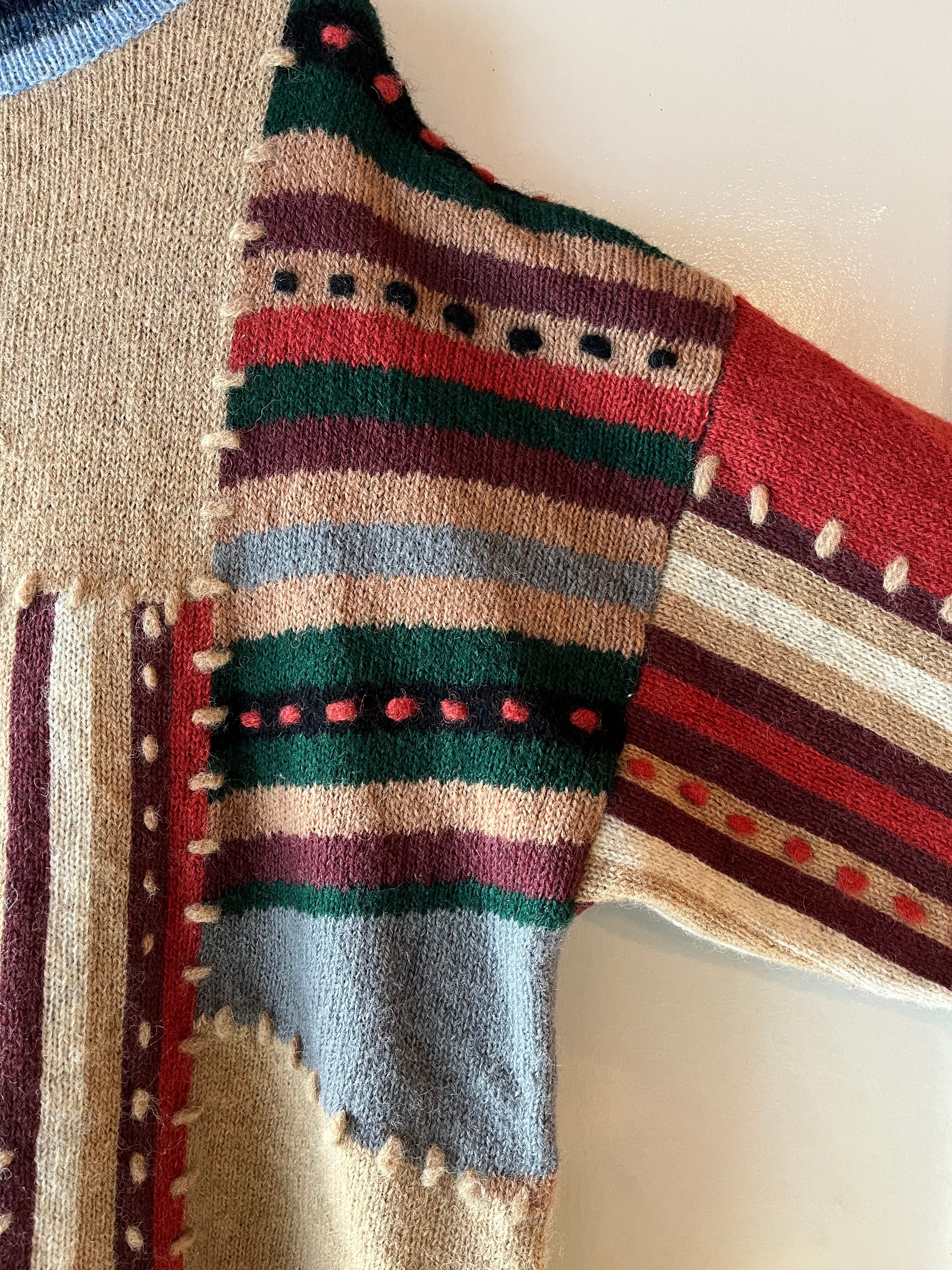 デザイン性のあるニットです。Shetland woolなどで、肌触りもよく暖かいです。暗くなりがちな冬アウターの下に着てポイントにしても可愛いと思います。
