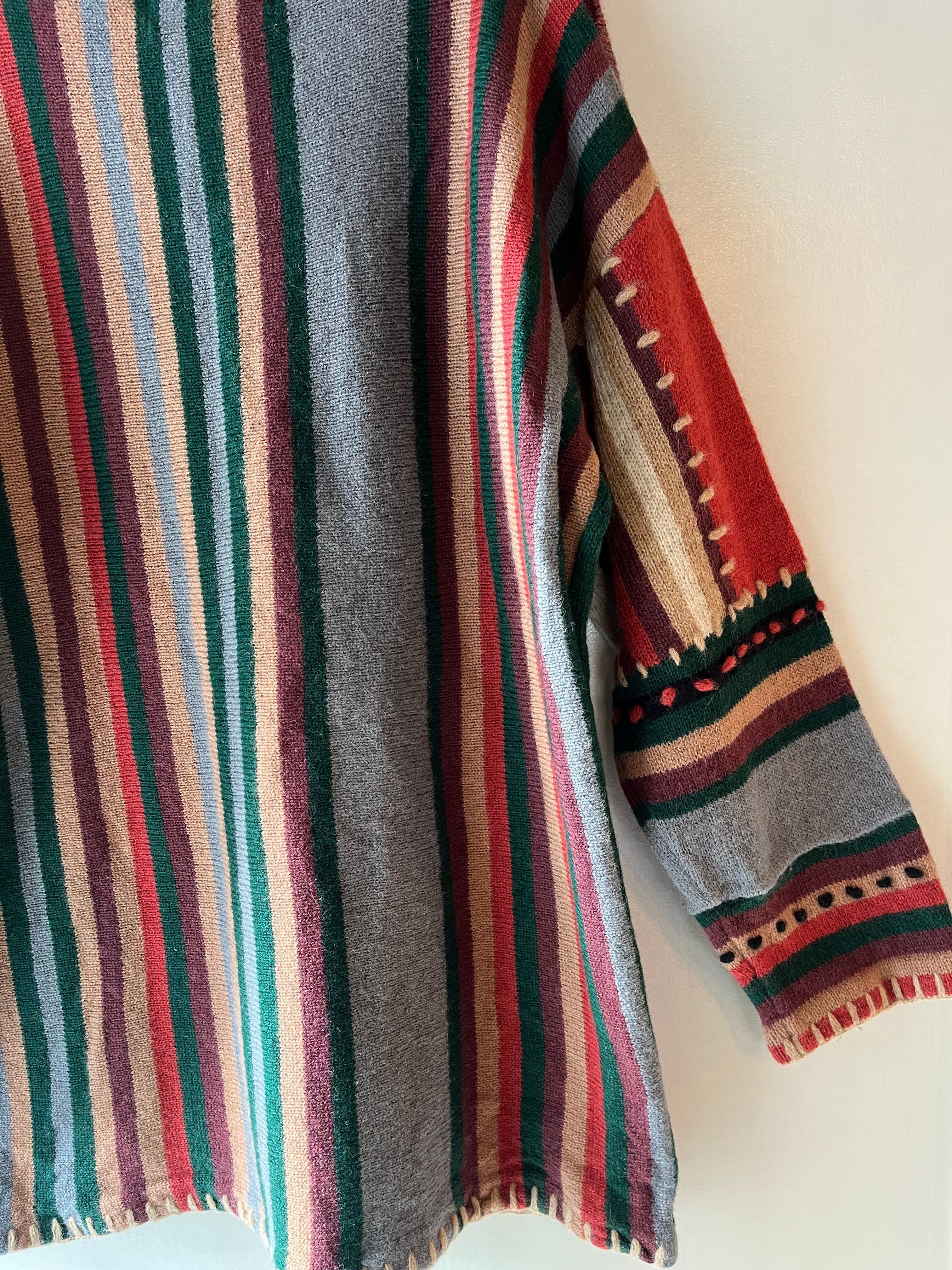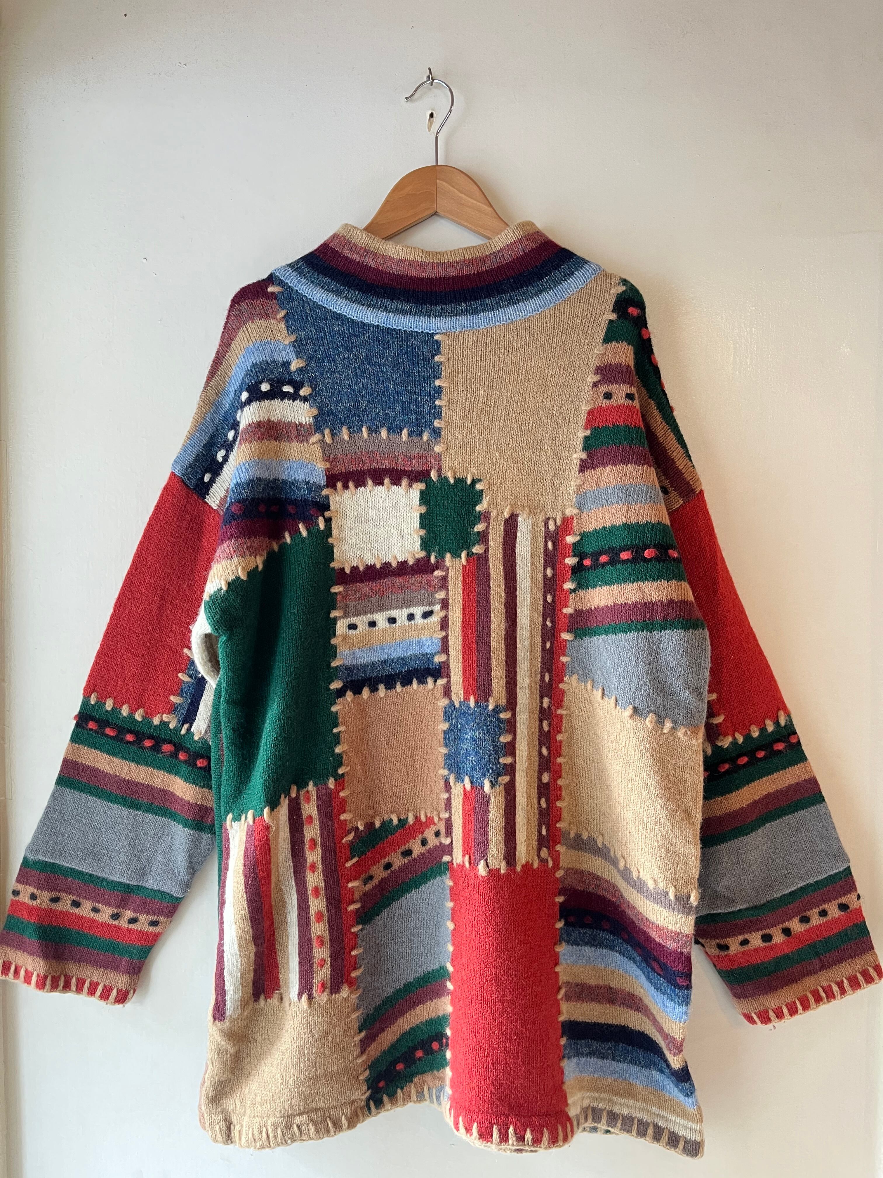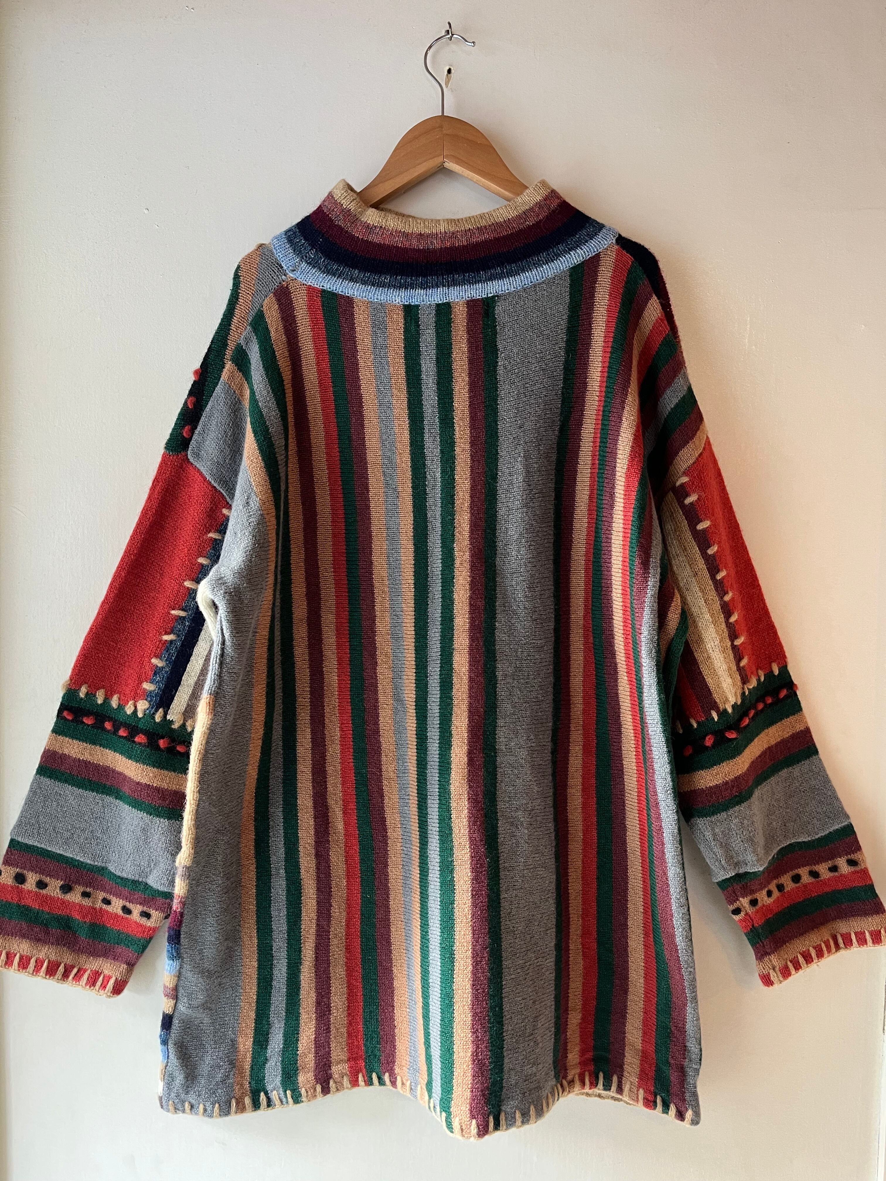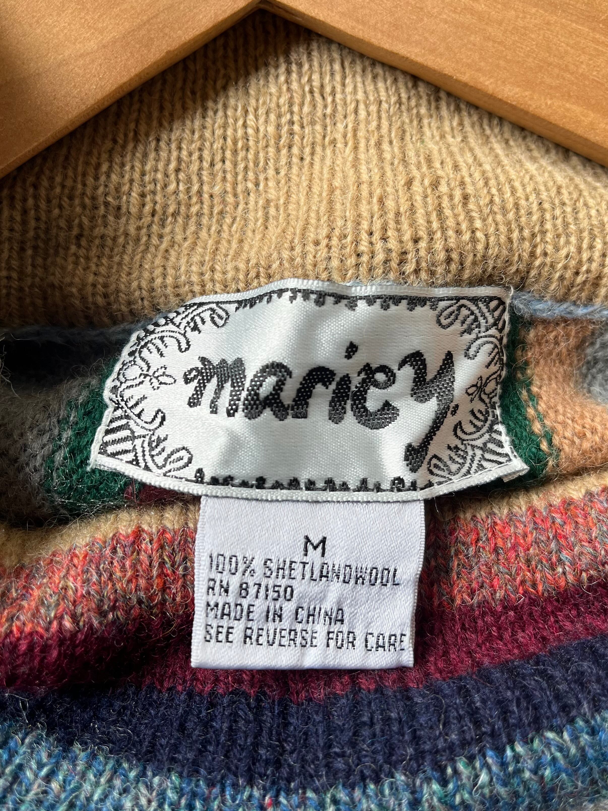 デザイン性のあるニットです。Shetland woolなどで、肌触りもよく暖かいです。暗くなりがちな冬アウターの下に着てポイントにしても可愛いと思います。